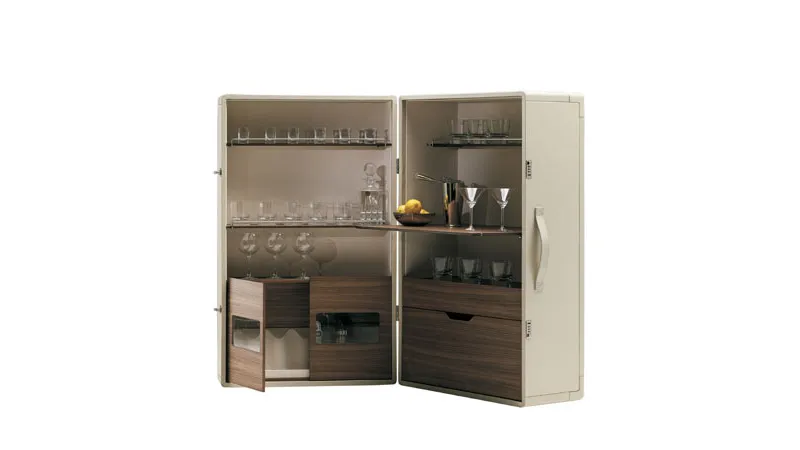 Con Isidoro di Poltrona Frau la casa riscopre il rito personale e conviviale del cocktail nell'arredamento in pelle. Il mobile bar diviene un segno di stile e di atmosfera. Nell’originale versione di Jean-Marie Massaud è un elegante contenitore su ruote con apertura a libro, maniglie esterne e chiusura a scatto. Un oggetto prezioso con materiali pregiati e studiato nel minimo dettaglio. L’attenta costruzione degli spazi interni prevede vani portabicchieri e portabottiglie corredati da miniringhiere di metallo. Una mensola ribaltabile funge da piano di lavoro. Il rivestimento esterno è in cuoio Saddle, mentre le mensole e i cassetti sono realizzati in multistrato di pioppo impiallacciato in noce canaletto.