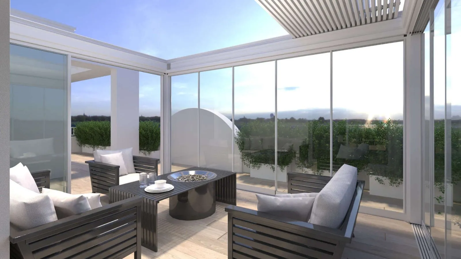 Rolling Roof Flat di Chirenti è una pergola autoportante in alluminio, con lamelle retraibili. È perfetta per godere dell'outdoor in tutte le stagioni con i suoi pannelli in vetro scorrevoli.