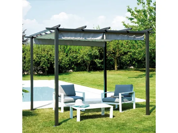 Nel primo caso la pergola è sostenuta da quattro pali ed è una struttura completamente autonoma. È perfetta per terrazzi e bordo piscina, fino a giardini di qualsiasi dimensione.
