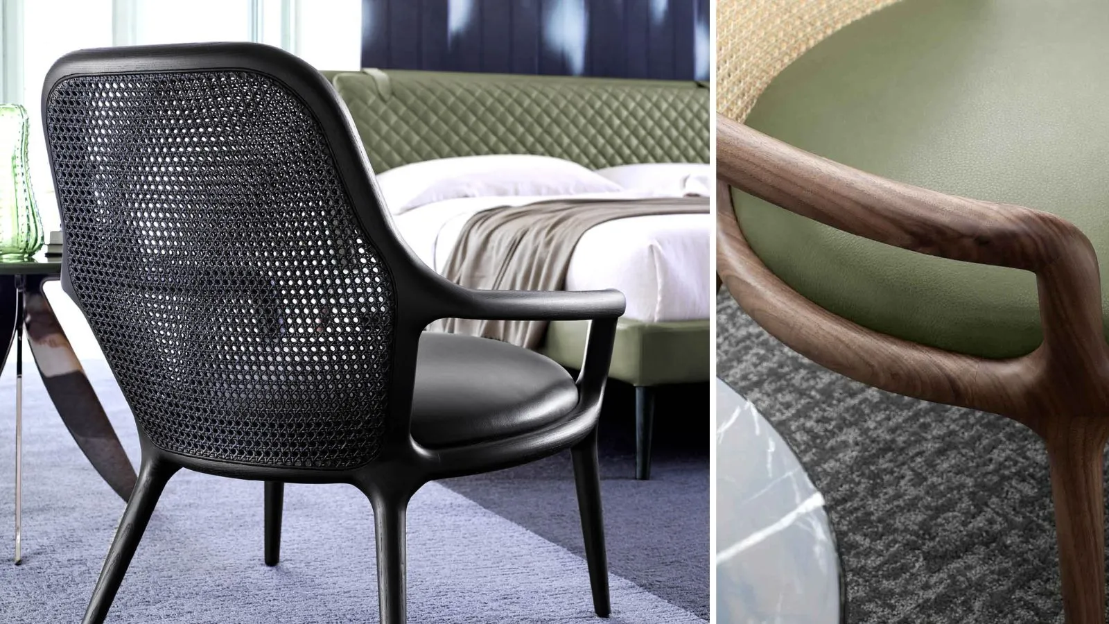 La poltrona Patti di BertO è in frassino, anche tinto nero. È disponibile con rivestimento della seduta in tessuto o pelle pieno fiore e schienale in paglia di Vienna.