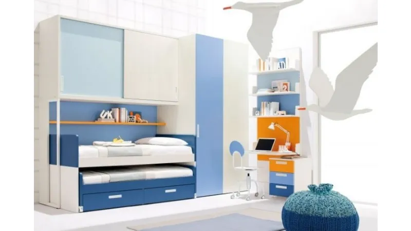 Le camerette ponte sono soluzioni d’arredo sempre più diffuse al giorno d’oggi in quanto consentono di ottimizzare lo spazio ottenendo al contempo una resa estetica più che soddisfacente. Colorate, allegre e funzionali le camerette a ponte sfruttano sia la zona alta delle pareti, sia quelle porzioni di stanza che altrimenti resterebbero inutilizzate. Gli armadi, le librerie e gli altri vani contenitori sono infatti collocati sopra il letto e spesso anche sopra lo scrittoio. Non di rado i letti sono 2, uno accanto all’altro oppure uno sopra l’altro. In quest’ultimo caso, se la formula è a castello il secondo letto si raggiunge tramite una scaletta; in alternativa il secondo letto è estraibile. Tutti gli elementi sono comunque collegati ed è proprio da tale caratteristica che deriva la denominazione “a ponte”: si tratta di una continuità strutturale e quasi aerea. Così il resto della stanza resta disponibile per giocare e per muoversi nella massima libertà. Il ponte può essere lineare oppure ad angolo. Com’è facile intuire, la prima opzione è adatta alle camerette più ampie e la seconda rappresenta una risposta per chi ha davvero i centimetri contati. Nella foto, la cameretta azzurra Start 22 di Clever composta da armadio a ponte, cabina armadio, scrivania e due letti di cui uno estraibile.