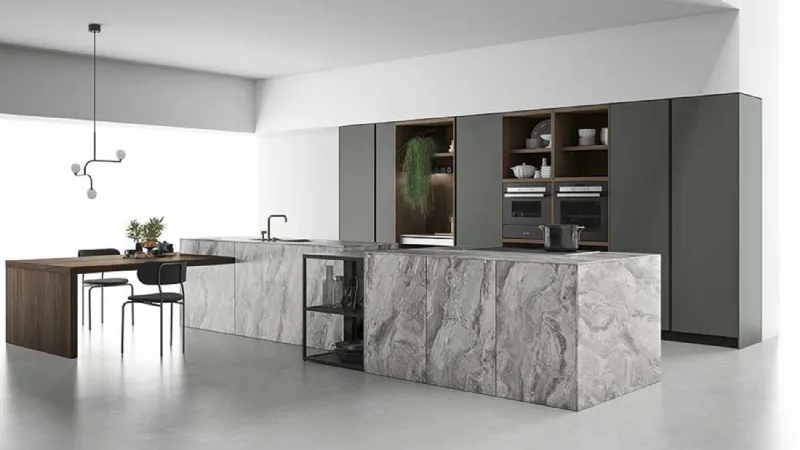La soluzione più impiegata, in questo caso, è la cucina soggiorno in comunicazione, con la scelta dell'isola. I programmi proposti dalle aziende sono molteplici e componibili, così da poter essere adattati allo spazio disponibile. Un esempio di cucina moderna ad isola che si adatta perfettamente in contesti moderni e contemporanei è il modello Elmar EL_01, che consente di scegliere tra numerose varianti.