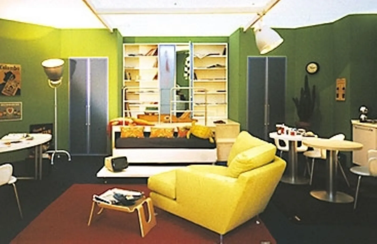 Di minialloggi si è occupata la mostra Fierarredo 2000, svoltasi a Bologna lo scorso giugno, che ne ha proposti quattro in un coinvolgente spazio curato dall’IDI (Interior Design Institute) di Milano. In pratica sono stati ben esemplificati quattro modi diversi di abitare ed arredare la casa piccola, destinati a essere fruiti rispettivamente da una donna di 27 anni (web designer), da un uomo di 37 anni (pilota di aerei), da una donna di 35 anni (stilista di moda) e da un uomo di 40 anni (attore teatrale). Sicuramente le professioni non sono state scelte a caso dai promotori dell’iniziativa, perché tre di tali professioni (pilota di aerei, stilista e attore) sono da tempo fra le più ricorrenti nella condizione dei singles mentre la quarta (web designer) è una delle più citate in riferimento ai BoBos, di cui si è tanto parlato. Questa soluzione è molto funzionale, appropriata per chi vive e lavora in casa, come la web designer cui è destinata. Nell’insieme si tratta di una struttura caratterizzata da colori forti, con il verde delle pareti piacevolmente contrastante con il blu della moquette. I colori stimolano la creatività e alimentano un’atmosfera “forte”. Ovunque vi sono librerie e contenitori, per dar ordine ai libri e alle… idee. Il letto, seminascosto sotto il soppalco, si trasforma in elemento di seduta, creando la zona conversazione. La cabina armadio è posta sul soppalco, con la possibilità di disporre, nello spazio rimasto libero, di una zona fitness. Il tutto è completato da una razionale postazione di lavoro, organizzata per l’alloggiamento del personal computer, degli altri oggetti tecnologici e degli apparecchi per la musica.