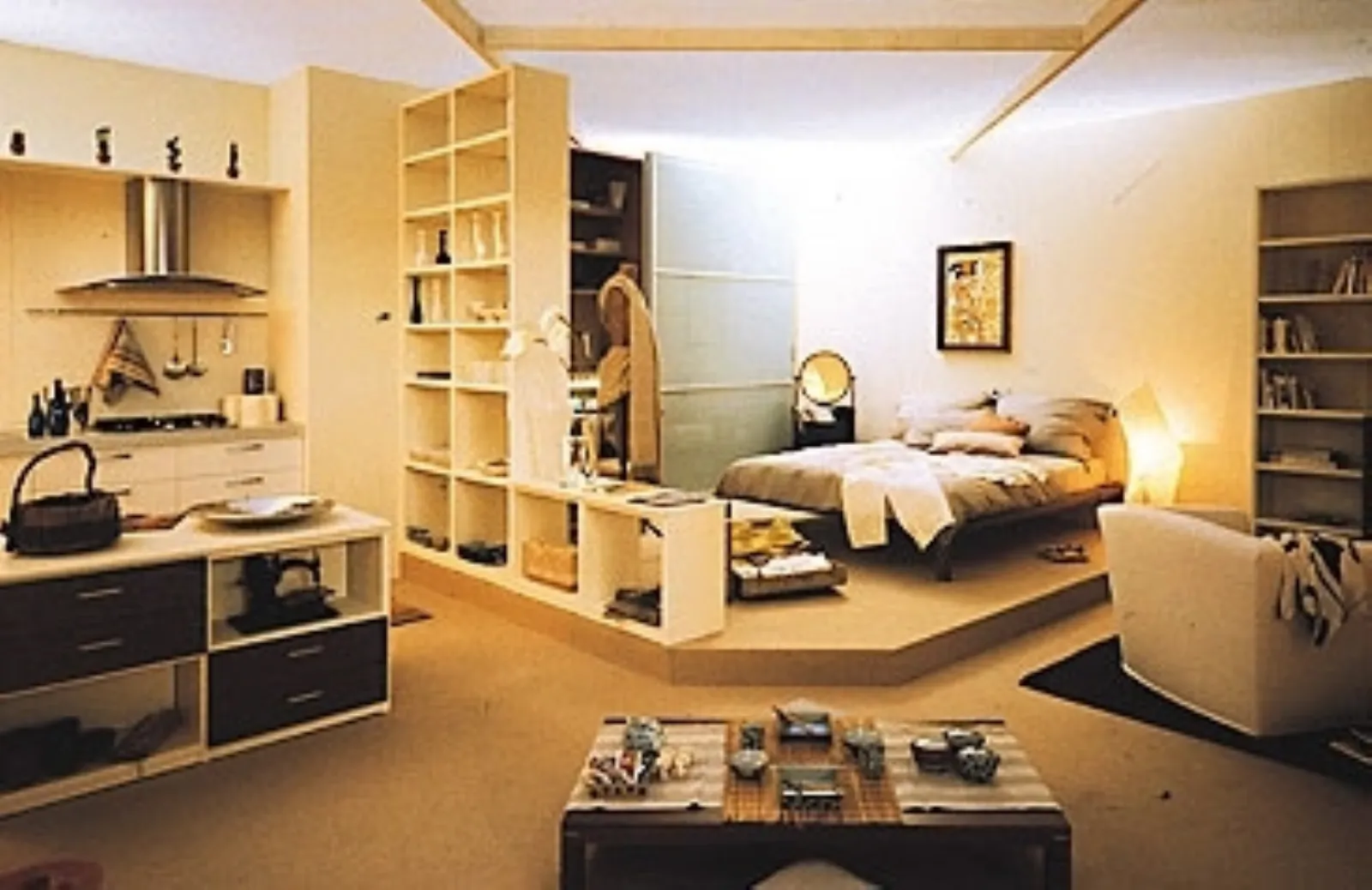 Questa soluzione è stilisticamente sobria ed essenziale. I colori dominanti sono il bianco e il beige caldo, due tonalità che rendono l’ambiente volutamente neutro, ma raffinato. Una pedana divide virtualmente lo spazio notte dalla zona giorno mentre il grande letto, vestito con biancheria preziosa, domina l’ambiente. Una libreria passante nasconde una cucina minimale. Il pranzo viene consumato con l’essenzialità dei rituali orientali. Una vecchia macchina per cucire, tante riviste di moda, un manichino di altri tempi vestito con tela preziosa, abiti in vista: tutto da a questo minialloggio l’aspetto di un atelier e, insieme, di una casa vissuta intensamente. Anche qui troviamo tanti spunti arredare su come arredare la casa piccola.