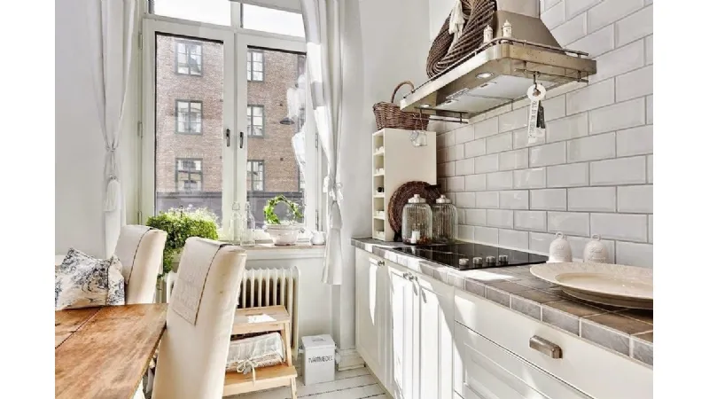 Un piccolo trucco per allargare otticamente le cucine piccole risiede nel preferire dei colori chiari nelle pareti e nella composizione dell'arredo. Soprattutto se l'ambiente è privo di finestre o esse si presentano di dimensioni ridotte, le pareti devono essere dipinte a chiaro, magari sfruttando la palette dei bianchi o delle tinte cipriate. Anche l'arredo chiede di essere il più chiaro possibile, preferendo legni quali l'abete ed evitando soluzioni massicce e troppo soffocanti. I tessili stessi devono porsi in armonia, quindi via libera a tessuti naturali dai colori neutri o arricchiti da grafiche leggere. Per donare una buona continuità stilistica, le tende e la biancheria da cucina possono accordarsi ai toni del panna, del nocciola chiaro e del sabbia, tinte che permettono di ottenere un effetto estetico riposante e al contempo di ampliare gli orizzonti sensoriale dell'ambiente.