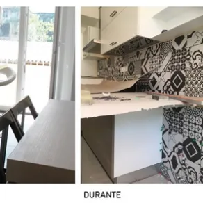 Questa idea permette di avere una nuova percezione visiva dell’ambiente senza spendere un occhio della testa. Adottare un nuovo rivestimento nello spazio compreso tra la base ed i pensili è una soluzione azzeccata per dare nuova funzionalità alla cucina, andando a sostituire una vecchia finitura in laminato o in gres, oppure inserendo un nuovo rivestimento dove prima non c’era. Come in foto, dove è stato realizzato un motivo decorativo effetto cementina, in versione black and white, che oltre a fare da paraschizzi va a proteggere il muro in prossimità della penisola. Le piastrelle sono state acquistate con un buon rapporto qualità/prezzo da Iperceramica (modello Quilt decoro 20x20, una cementina decorativa patchwork in bianco e nero, fornita in ben 13 soggetti diversi) e la posa in opera è durata appena due giorni, il tempo di incollare le piastrelle e stuccarle. La cucina ha così assunto una nuova personalità, più grintosa e modaiola.
