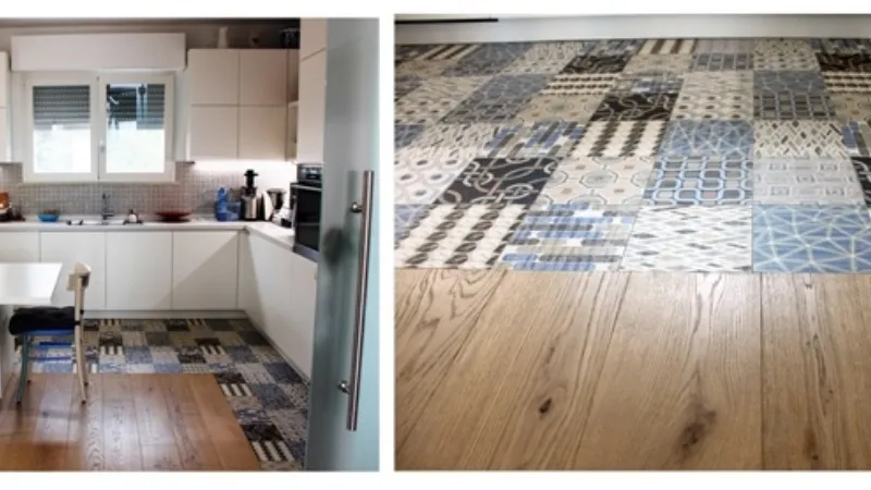 Nella foto è stato creato un perimetro in gres tutt’attorno alla cucina ad angolo, per salvaguardare il pavimento da eventuali schizzi e macchie. Il parquet è stato invece lasciato nella restante parte della cucina, meno soggetta ad un uso “aggressivo”. La pavimentazione in gres è Cementina_20 di Ceramica Fioranese, nel formato 20x20, che regala un tocco vintage all’ambiente rendendolo più accogliente e confortevole. Il formato piccolo e quadrato permette una posa più semplice rispetto a formati più grandi, ed è da preferite in questi progetti di cambio look.