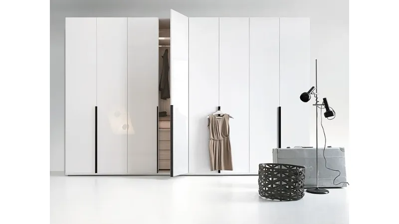 In foto: Lema, Armadio al Centimetro con ante battenti Flago. La superficie bianca lucida, abbinata alla maniglia in alluminio anodizzato bronzo crea un sofisticato contrasto.