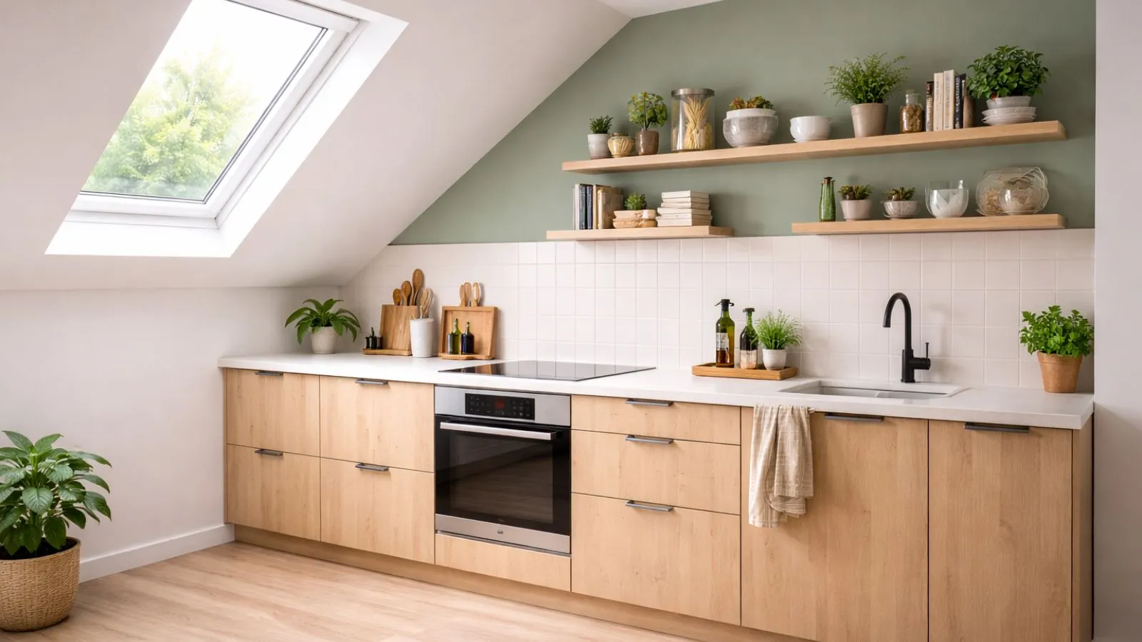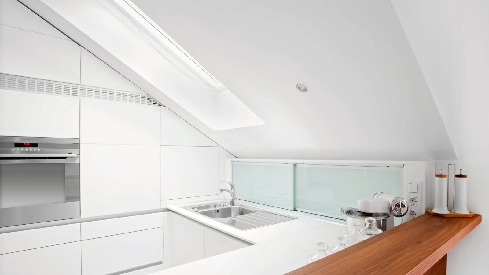 - In cucina posiziona le basi nelle zone con altezza adeguata, così da lavorare comodamente. Se il soffitto è troppo spiovente potrebbe essere necessario rinunciare ai pensili. In caso contrario si possono inserire moduli sospesi tagliati su misura, che si adeguano all’inclinazione della falda.
