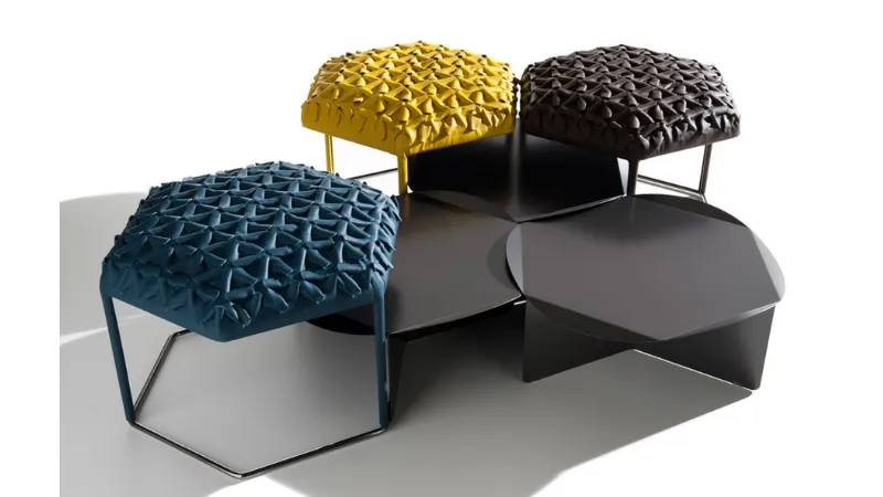 Hive di B&B Italia è una collezione formata da pouf e tavolino esagonali aggregabili a creare delle composizioni ispirate alla struttura dell’alveare. Il pouf è realizzato con struttura in acciaio cromato, fondo e puntali in materiale plastico e rivestimento in pelle. La seduta è in multistrato di legno con imbottitura in poliuretano sagomato, fodera in poliuretano, polipropilene e poliammide. Il tavolino Hive è invece realizzato interamente in acciaio verniciato con puntali in materiale plastico.