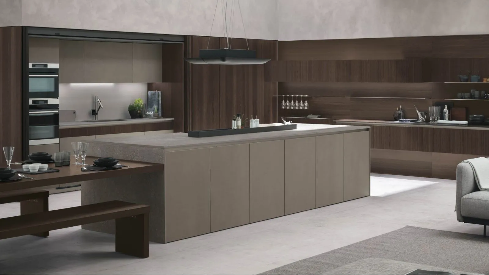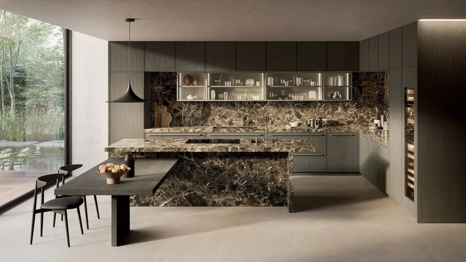 La matericità è protagonista della cucina Margot di Euromobil, che si esprime attraverso la bellezza della pietra naturale. Il marmo Emperador lucido ci connette con la natura e regala atmosfere uniche e senza tempo.