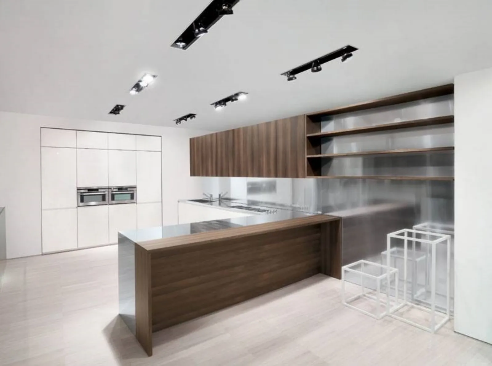 Nella cucina moderna, la penisola veicola “movimento” all’ambiente ed è la soluzione perfetta in un’area cottura open space perché sviluppa un’ideale separazione tra l’area in cui si preparano i pasti e il living. Si può decidere per una composizione a “L” oppure per una soluzione a “C”, creando così una specie di golfo in cui racchiudere la zona pranzo con tavolo e sedute. Ma come si presenta la penisola? Può essere spaziosa o piccola, un normale piano di lavoro oppure attrezzata con contenitori per ottimizzare lo spazio disponibile. Può altresì ospitare il lavello e il piano cottura o ancora un confortevole bancone snack per consumare colazione e piccoli pasti veloci. Lineare e squadrata o arrotondata per armonizzarsi con gli altri elementi, la morfologia può essere variabile. In foto, cucina con penisola MK 04 di MK formata da basi con ante in laccato lucido bianco, top, schienali e fianchi in acciaio inox ed elemento snack in acacia termotrattata. La composizione è completata dai pensili con ante in acacia termotrattata, elementi a giorno in acacia termotrattata con schienale in acciaio inox e blocco colonne con frontali in laccato lucido bianco.