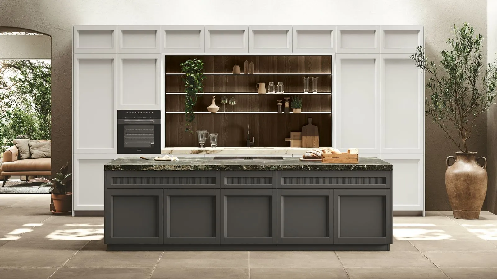 Le ante delle cucine contemporanee sono un esempio di come i tratti tradizionali possano essere rivisitati in chiave moderna. Il caratteristico telaio con cornice oggi assume una forma più discreta, più o meno sottile a seconda delle preferenze estetiche. È un dettaglio che contribuisce a creare un aspetto elegante ma otticamente meno imponente, che non stanca mai e supera le tendenze.