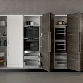 Scegliere una cucina Febal poi ha anche un altro vantaggio: Febal Easy 10, il servizio che permette di estendere la garanzia sul proprio acquisto per altri 8 anni dopo i 2 canonici offerti dalla normativa nazionale. Ciò significa affidarsi ad un brand con un qualificato servizio post vendita. In foto, della nuova collezione Chantal mostriamo la composizione 04. L’armadio con apertura a soffietto contiene gli elettrodomestici: forno, cantinetta per il vino e macchina per il sottovuoto, diventando l’elemento di congiunzione tra lo spazio di preparazione dei cibi e l’ambiente living openspace, celando alla vista con eleganza la parte più tecnologica della cucina.