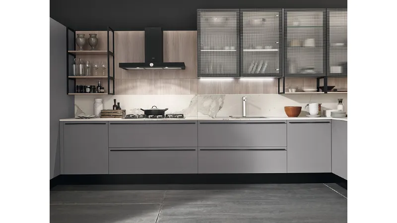 Più accattivante e grintosa è Ice & Sand Industrial Edition, la cucina moderna ad angolo contaminata da maniglie vintage e da vetri retinati dall’atmosfera vissuta (foto3).