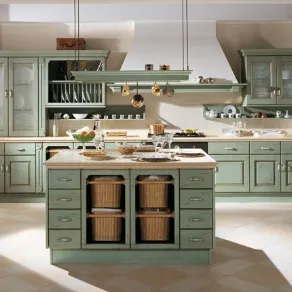 La cucina stile country inglese è un tipo di ambiente familiare, ma allo stesso tempo elegante e raffinato, tipico del gusto britannico in materia di arredamento. Le cucine in stile country di questo tipo curano ogni minimo dettaglio dell’arredo, rifacendosi proprio allo stile tradizionale inglese. Di solito queste cucine prediligono colori chiari, come il beige, il bianco, l’avorio, il verde acqua o l’azzurro cielo; i complementi d’arredo sono molto semplici a livello di design, proprio per cercare di ricreare un atmosfera country ma al contempo elegante, tipica delle residenze inglesi delle brughiere. Se si possiede una cucina molto grande, per rendere al meglio lo stile inglese conviene optare per un parquet, che si abbini nei colori a quelli dell'arredo. Il tavolo e le sedie possono essere di legno purché sia dello stesso colore dei mobili, oppure in ferro battuto. Poi non può mancare un’alta credenza a vetrina, dove riporre i piatti e i bicchieri del servizio buono. Infine, bisogna lasciare spazio alla creatività nelle decorazioni, come cestini di vimini, piantine fiorite, quadretti in stile country o vasi di ceramica. In foto: modello Micol Record cucine.