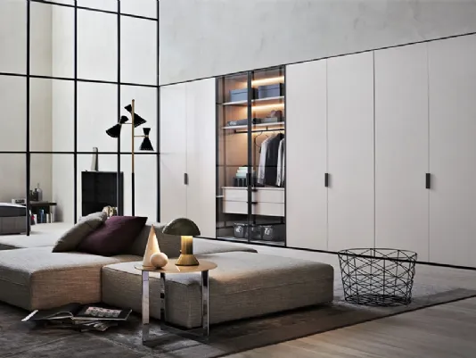 In foto: armadio di Lema con ante a battente in laccato proposte nel modello Conca senza maniglie esterne. Il sistema di armadi Al Centimetro offre una modularità infinita per arredare gli spazi con armadi su misura grazie alla ricca varietà di moduli. I sistemi di apertura disponibili sono a battente o scorrevole, le finiture interne e i frontali delle ante sono previsti in numerose varianti.
