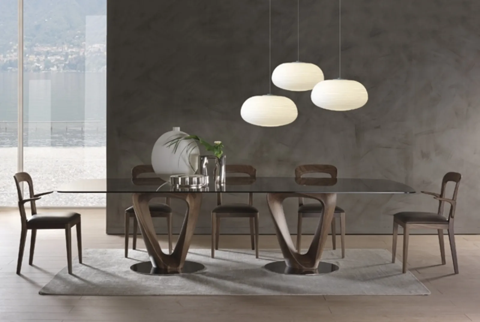 Nell’immagine: tavolo da pranzo Mobius di Pacini & Cappellini, con basamento in massello di noce canaletto o frassino. Disco a pavimento in acciaio cromato. Piano in vetro naturale o bronzo. Disponibile con piano rotondo, quadrato, quadrato sagomato, rettangolare, a botte, ovale.