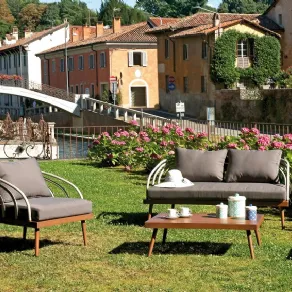 Caratterizzati da colori vivaci o da tonalità più sobrie, principalmente da strutture in legno oppure in metallo, ma anche realizzate con materiali più innovativi come la resina fiber-glass (si veda il paragrafo precedente); rivestiti con tessuti all’avanguardia e dotati di imbottiture ultra comode: i divanetti da giardino sono resistenti, non temono l’azione degli agenti atmosferici e conservano intatto il loro fascino per lungo tempo. Lo stile moderno viene spesso valorizzato da tracce di tradizione, rivisitate al fine di offrire prodotti esteticamente di grande impatto. In foto Hugo, novità Unopiù 2018. Frutta di una riuscita combinazione tra teak, acciaio inox e tessuto tecnologico, comprende nella sua stessa struttura anche tavolini laterali: si ottiene, così, quasi l’illusione di un salotto galleggiante. Hugo è ispirato al design americano degli anni Cinquanta. Le sedute sono sfoderabili, per una maggiore praticità.
