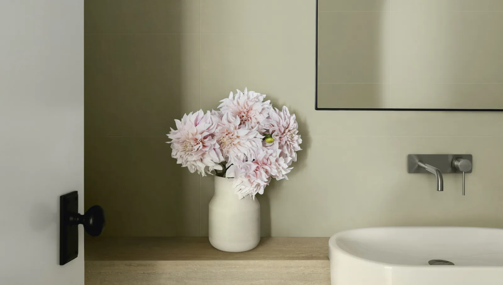 Look minimal e fresco per la collezione di rivestimenti Flora di Marazzi, proposta in quattro tonalità pastello (Bianco, Azzurro, Rosa, Verde), leggere e polverose e in una superficie che evoca l’intonaco come resina stesa.
