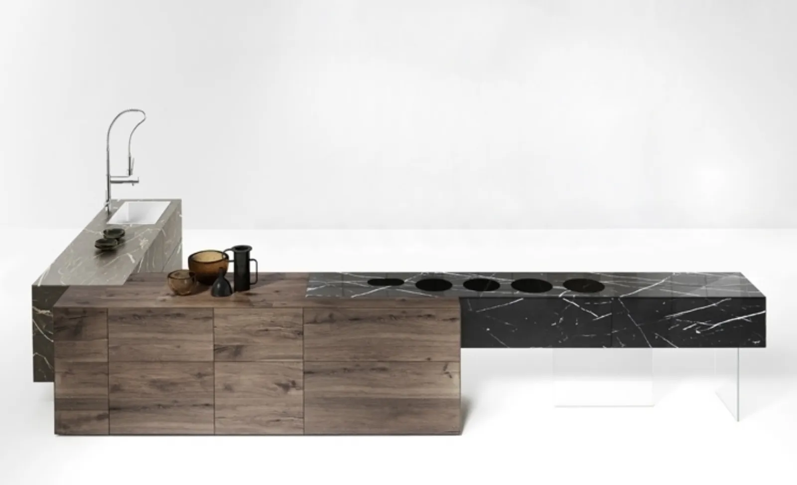 Ma quanti ripiani ci possono essere per una cucina libera da vincoli, nei cui mobili c’entra di tutto… di più? Valdesign, con la sua Sumac, dal design di Bruna Vaccher, con il suo nome che ricorda la spezia usata nel MedioOriente (soprattutto in Libano) per preparare i piatti all’inizio della primavera, vuole proprio suggerire una “rinascita” in cucina e con questo modello lo “racconterà” a EuroCucina, con un contemporaneo gioco di pieni e vuoti: capienti pensili e vani a giorno che possono essere chiusi in parte da ante scorrevoli (laccate o rovere balken) dalla struttura in alluminio alveolare con un robusto spessore di 12 mm, nonché alzate sopra i piani attrezzabili con vani utili per posarci accessori a go go. Un insieme “open”, di grande flessibilità, per organizzare i propri spazi dando carattere.