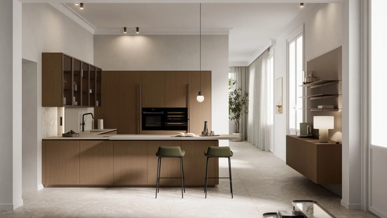 Il minimalismo si attenua, le geometrie diventano più gentili e si arrotondano nei terminali, contribuendo a costruire un ambiente visivamente più armonico e accogliente. Non è solo una scelta estetica, ma una direzione progettuale che risponde ad un’esigenza più ampia: rendere la cucina meno tecnica e più integrata nella dimensione domestica.