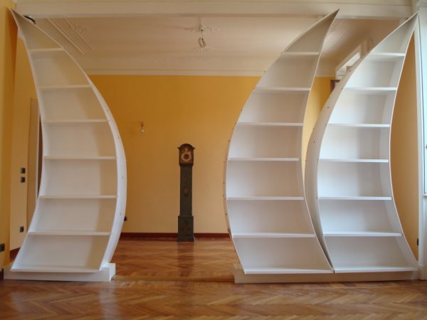 Ho fatto realizzare da un falegname per la mia nuova casa una libreria a forma di vela che fungesse da divisorio fra la zona pranzo e il salotto. La libreria è attrezzata da entrambi i lati con gli scaffali. all'inizio era progettata color noce chiaro. Poi ho deciso di farla smaltare in bianco, perchè c'erano troppe tonalità di legni diversi.