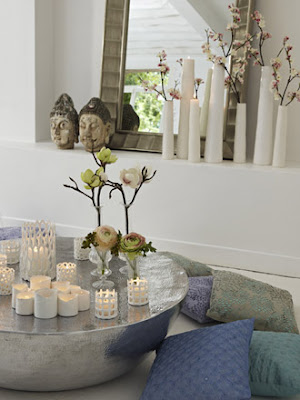 io ho un vassoio tondo stile marocchino di quelli tutti lavorati con sopra candele bianche di varie forme e dimensioni