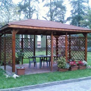 Gazebi in legno e pergolati consentono di sfruttare meglio gli spazi esterni e anche di abbellirli. Si tenga presente, però, che a seconda del tipo di struttura che si installa occorrono delle autorizzazioni al Comune di appartenenza o al condominio in cui si risiede. Si consiglia dunque di consultare il Regolamento Edilizio comunale e anche rivolgersi a un tecnico abilitato per una consulenza. Di solito, comunque, l'installazione di un pergolato o gazebo, purché privo di qualsiasi chiusura laterale o copertura fissa, rientra nell'ambito della manutenzione straordinaria, e quindi per l’installazione viene richiesta la CIL o la CILA oppure la SCIA. Il gazebo in legno, generalmente, viene venduto in confezioni standardizzate e si monta con una certa facilità; i pannelli sono già tagliati a misura e bisogna soltanto assemblarli, nel kit sono compresi l’intelaiatura, le viti e tutti gli strumenti di fissaggio. Si consiglia di scegliere legni di prima scelta, come il pino o l’abete, che resistono bene alle intemperie. Nella foto, un gazebo in legno con grigliati realizzato da Arredoghelli, azienda operante nel settore dal 1966.