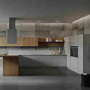 In foto il modello Ambiente F#17 della linea Sistema 2.1, una cucina ad isola Copat Life dal design essenziale ed elegante, che si distingue per bancone snack in laminato HPL, colonne con vani e terminale a giorno, ante a gola realizzate in melaminico termostrutturato.
