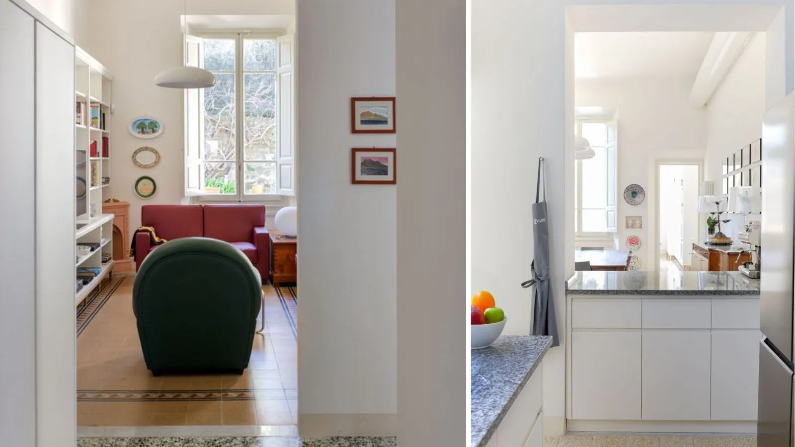 Anche in cucina le pareti sono bianche, così come le mensole e i pensili, per ampliare visivamente il locale e valorizzare l'ordine. Gli oggetti raccolti nel tempo raccontano la storia di una vita dedicata alla buona tavola. In questo luogo, alla proprietaria piace preparare una ricetta tipica toscana che viene tramandata da generazioni: la fettunta. È una preparazione che utilizza pochi ingredienti ma di buona qualità e parla di giornate trascorse con amicizie sincere.