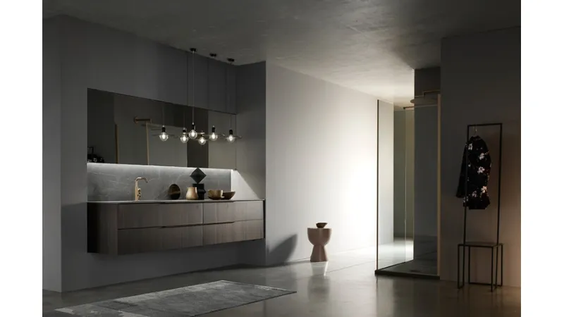 Pollock non passa certo inosservato e deve il suo forte impatto soprattutto alla nuova finitura Eucalipto e ai dettagli bronzati. Pratiche ed eleganti, le nuove maniglie sono talmente sottili da assomigliare a linee che risaltano sul fondo scuro dell’eucalipto. Per chi volesse creare una composizione asimmetrica, esse possono essere posizionate a destra o a sinistra del frontale; al contrario, si può creare una sorta di maniglia centrale accostando due basi diverse. La rubinetteria e i profili della chiusura doccia riprendono la finitura bronzata delle maniglie. A completare la composizione entra in scena il piano in gres da 1 cm con vasca integrata. Alzatina posteriore e piatto doccia sono composti dello stesso materiale.