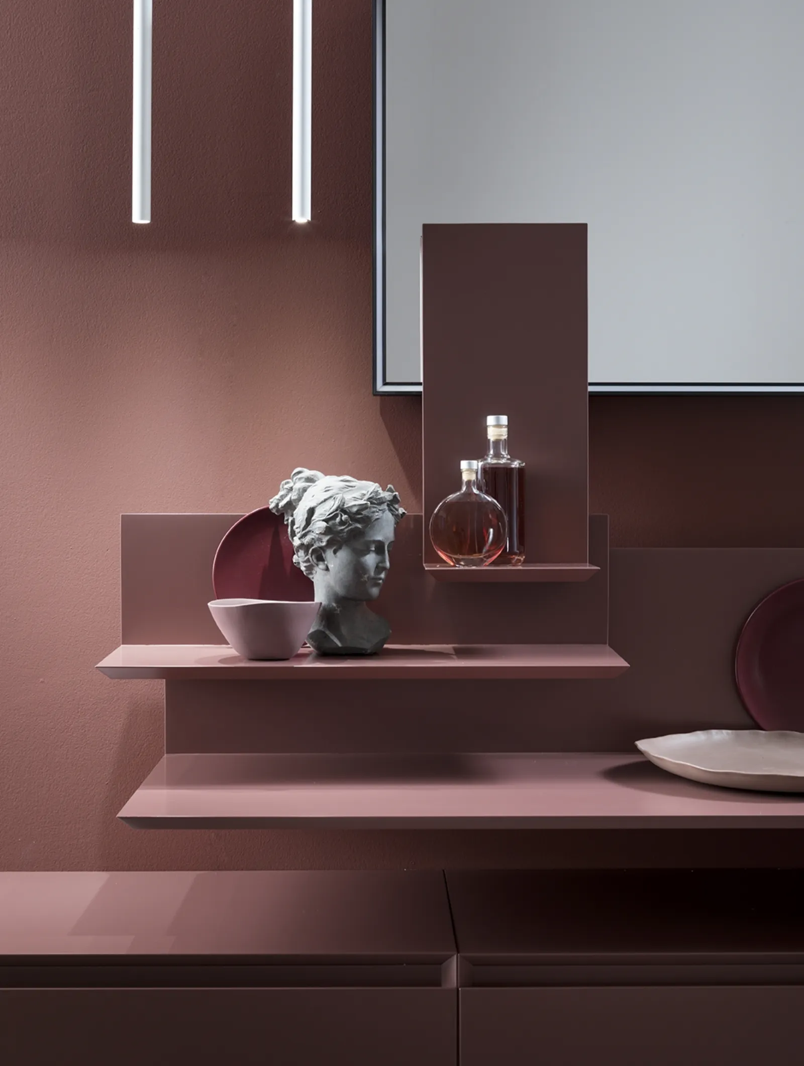 Dafne è testimonial riuscita e sincera del concetto di minimal applicato all’arredamento, caratterizzandosi per il taglio a 45° non solo sulle basi sospese, ma anche per quanto riguarda top e mensole. I pannelli tagliati a 45° lungo tutto il perimetro sembrano delle grandi mensole in lamiere e conferiscono leggerezza ed eleganza ad un piano chiamato a sostenere il peso di un lavabo in marmo. Sul piano più grande c’è una luce led perimetrale, posta nella parte posteriore e utilizzabile come luce di cortesia. La grande personalizzazione del modello rappresenta il suo più grande punto di forza e valore aggiunto: le mensole che poggiano su quella più grande sono dotate di un sistema di aggancio sul retro che consente di riposizionarle in qualsiasi momento a seconda delle necessità. Scocca, frontali e top sono in laccato, una soluzione ideale per chi ama l’effetto pendant con un’unica finitura. I colori laccati, sia che siano scelti lucidi o opachi, in tinta o abbinati, rendono le superfici lisce al tatto e particolarmente omogenee alla vista. Così come il resto delle struttura, anche la specchiera è caratterizzata da un telaio a 45°, che riprende le linee di basi e piano top. Giocando sui richiami, il nero del telaio è stato ripreso sulla rubinetteria e sui profili della cabina doccia.