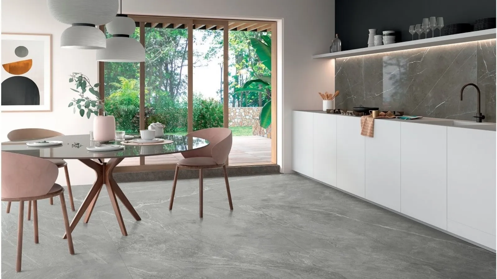 La matericità delle rocce calcaree e delle diverse colorazioni in natura, caratterizza il gres porcellanato Noble Stone di La Fabbrica Ava del Gruppo Italcer, come il beige-grey nell’immagine.