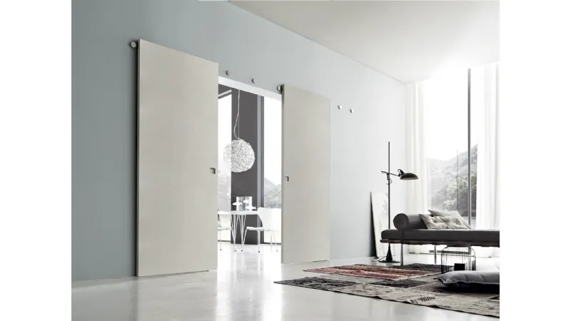 Nelle porte scorrevoli esterno muro il sistema di scorrimento deve essere efficace. Solitamente il binario di scorrimento è completamente invisibile e coperto dal telaio o da una mantovana sia che la porta sia aperta che chiusa. La tecnologia del binario è abbastanza raffinata. Il binario può essere in alluminio o in acciaio ed è composto generalmente da ruote e cuscinetti a rulli ammortizzati che consentono una frenatura graduale a fine corsa. Alcuni sistemi sono talmente performanti e innovativi che la porta appare come sospesa in aria senza alcun aggancio.E' possibile installare una sola porta che scorra verso sinistra o destra. Se abbiamo a disposizione una parete più grande, una soluzione di grande effetto è l'installazione di due porte che scorrano in direzioni opposte o più porte che scorrano tutte nello stesso verso di direzione.