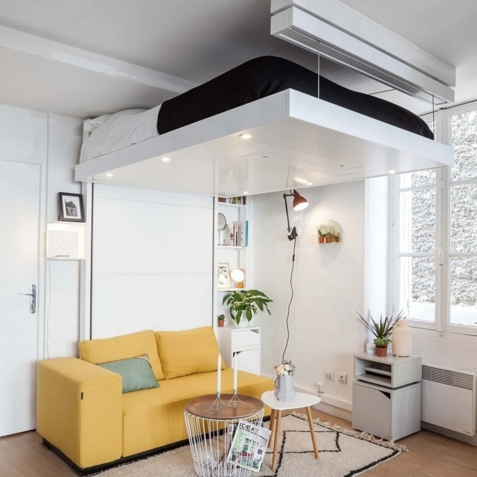 Per recuperare spazio dove non c’è, alcuni designer hanno avuto l’ispirazione di un letto che scompare sul soffitto, scendendo e salendo grazie a un meccanismo elettrico. L’azienda francese BedUp ha creato una soluzione del genere con il modello BedUp® VISION che ha un supporto alla parete all’altezza della testata ed è sospeso da due cavi in acciaio, che garantiscono stabilità e sicurezza, senza necessità di pareti portanti. Il letto, che arriva a un’altezza standard tra 2metri e 20, 2 metri e 80 (ma può essere disegnato su misura per varie esigenze), garantisce in pratica una visione “panoramica” sulla stanza ed è pensato in modo da arrivare fino in fondo poggiandosi semplicemente su mobili e oggetti ad hoc. E rimane ben saldo al pavimento grazie all’apporto di due gambe oblique retrattili che appunto scompaiono nella parte inferiore in cui se si vuole si possono integrare luci anche a led. Il letto si può fermare pure prima di arrivare a terra, a seconda della necessità, diventando tavolino o divano, con tanto di scaletta per salire/scendere. Nelle possibili configurazioni, rientra pure il supporto murario che può essere personalizzato dotandolo di mensole e ripiani, così come è possibile equipaggiare il letto con lampade collocate nei punti opportuni per il massimo della fruibilità. Con questo progetto, in pratica, tutto l’ingombro di un letto matrimoniale svanisce per lasciare spazio (è proprio il caso di dirlo) a un salottino e a una zona giorno in piena regola che si fa da parte (pur rimanendo al suo posto) nel momento opportuno. Il letto sospeso si monta in una giornata e ha una garanzia di 5 anni.