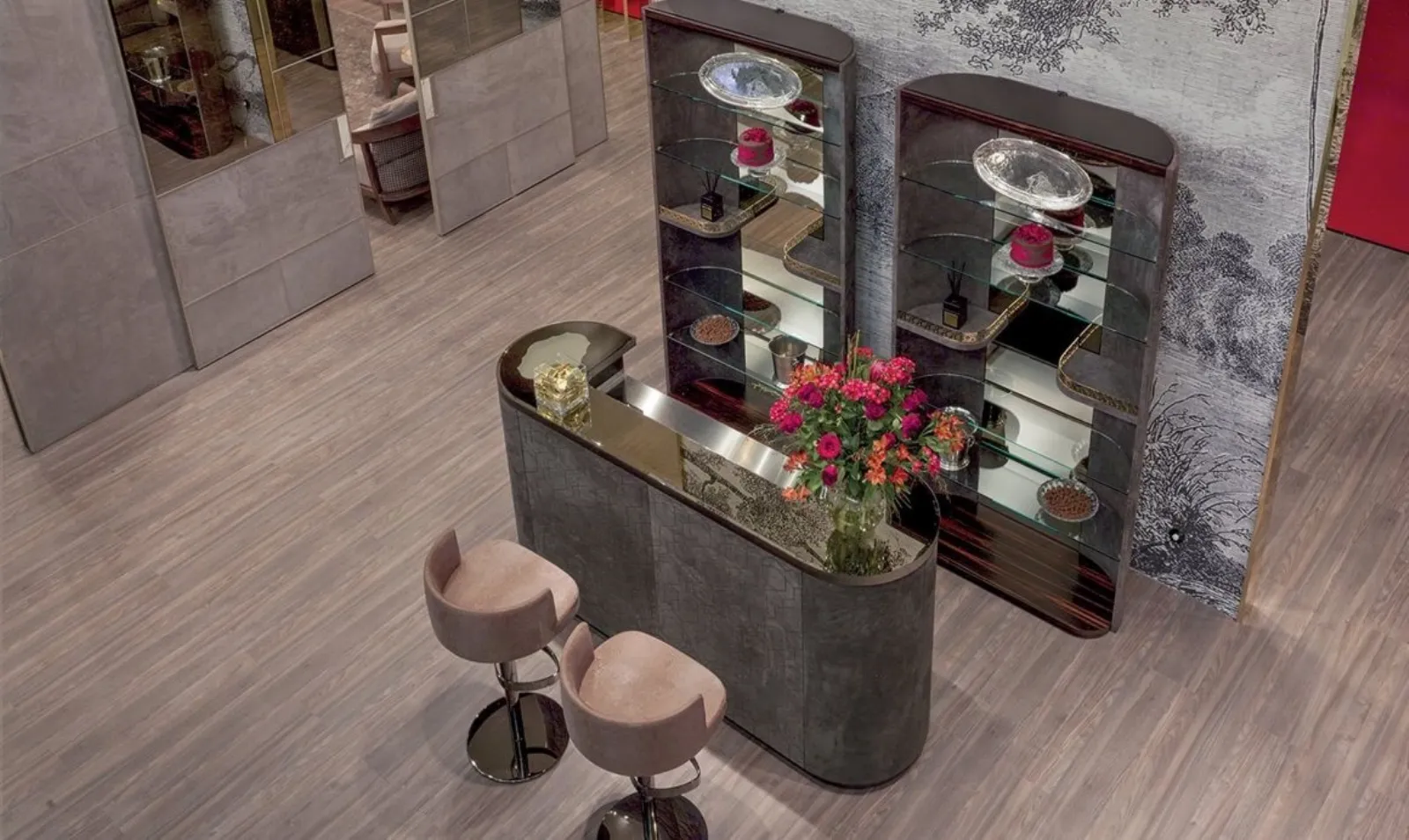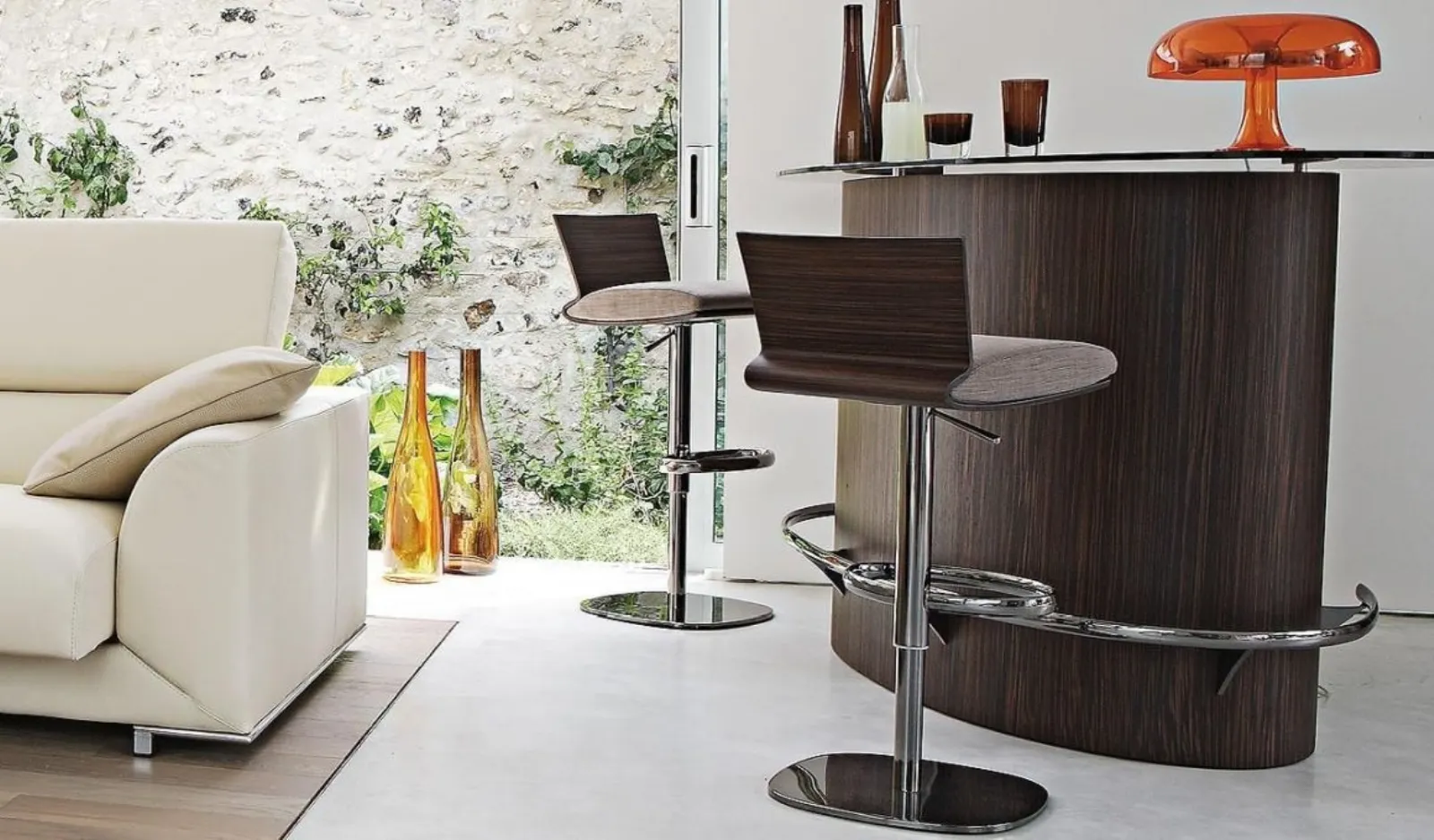Nelle foto, 3 interessanti esempi: l’elemento principale del primo è il mobile G.Bar Eucalipto Affumicato di Italianelements, il cui interno è composto da ripiani in vetro, tasche, cassetti e contenitori rivestiti in pelle o laccati, specchio inciso con motivo orizzontale; c’è anche l’illuminazione a Led. La seconda foto mostra il mobile Bar Ublo di Roche Bobois e gli sgabelli della stessa collezione. Nella terza immagine, a catalizzare l’attenzione è il mobile bar Isidoro di Poltrona Frau.