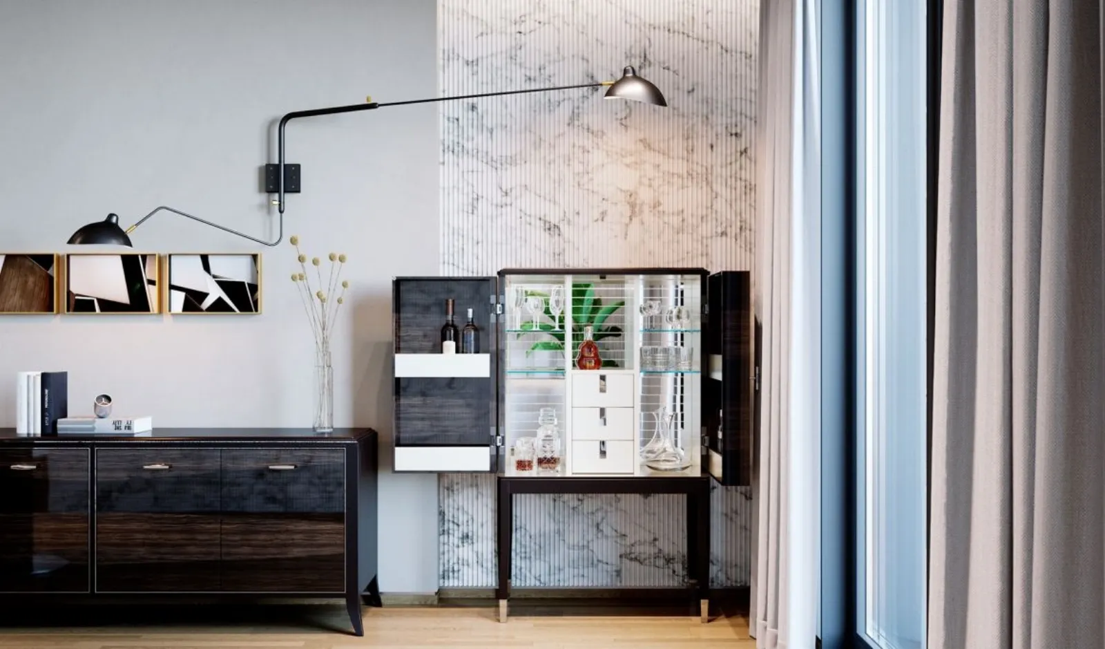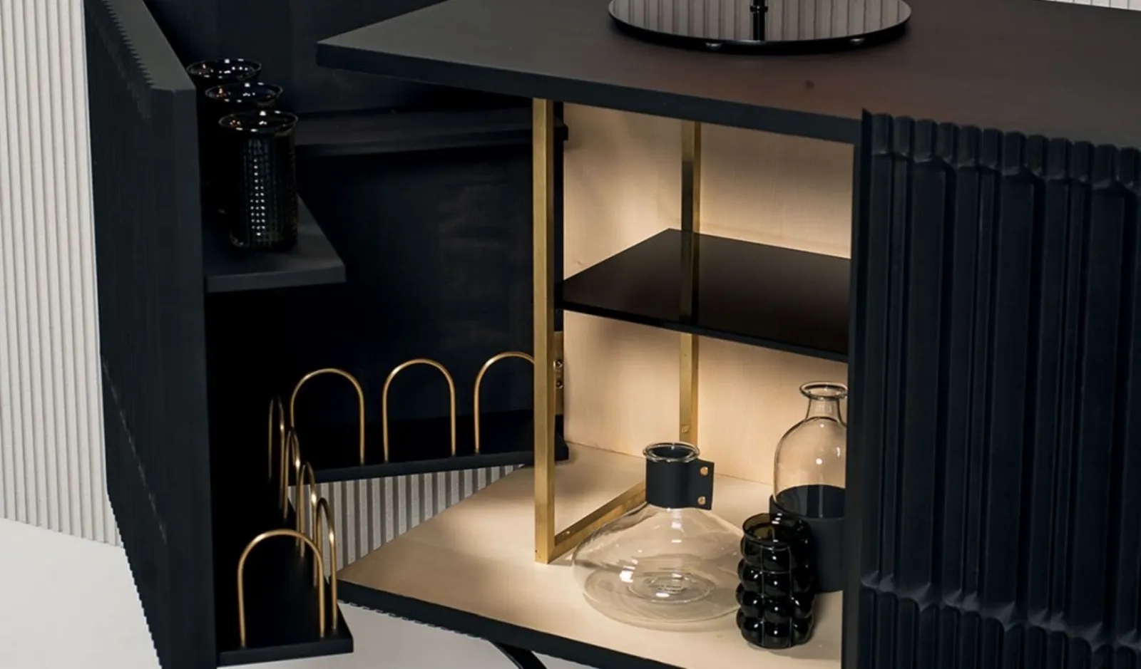 Infine vi mostriamo gli interni del mobile Guell di Baxter: si noti il ripiano in vetro nero tinto in pasta e il portabottiglie in ottone. Guell è un mobile basso, a forma di parallelepipedo, sostanzialmente ha l’aspetto di una madia. La struttura poggia su eleganti gambe in metallo ed è realizzata in massello di acero.