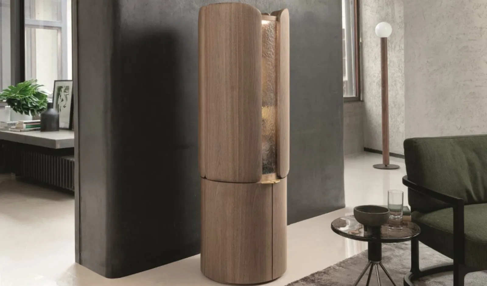 Il primo è un mobile davvero strategico, oltre che di grande impatto: Mary, disegnato da Patrick Jouin per Porada. L’ingombro è ridotto ai minimi termini, eppure la capacità contenitiva è più che soddisfacente; c’è posto per una gran quantità di bottiglie e bicchieri. Il vano superiore presente due ripiani più quello coincidente con la base, quello inferiore ne ha uno (cui si aggiunge, anche in questo caso, la base). Le ante sono in noce canaletta con dettaglio in vetro Ice. Da segnalare l’illuminazione a Led ricaricabile tramite USB.