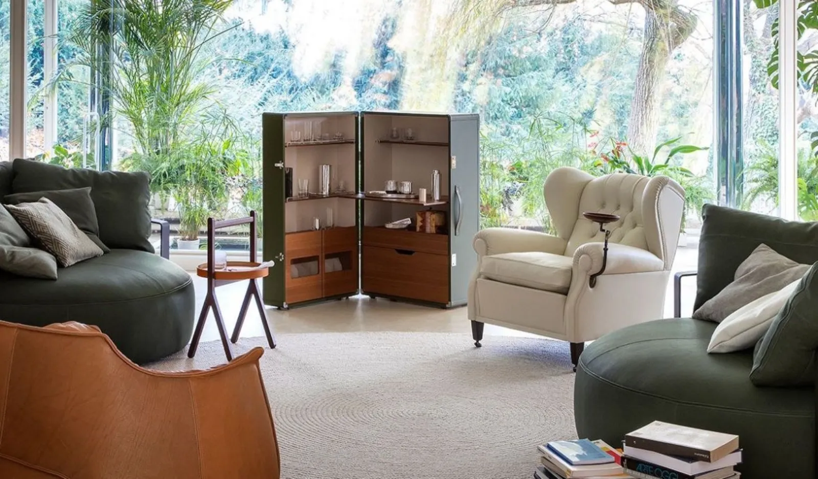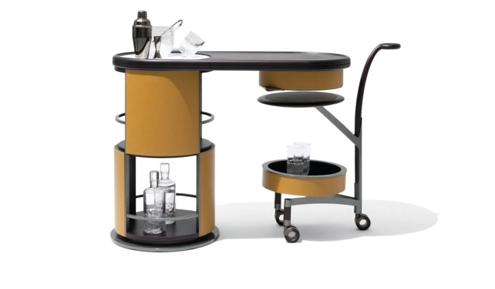 Nella seconda foto, ecco l’ingegnoso Host di Georgetti, composto da un carrello e da una colonna bar. La struttura è in MDF e multistrato curvato, il rivestimento in pelle è arricchito da una bordatura in legno massiccio. Le parti in metallo presentano una finitura pewter. I piani in legno hanno un inserto in marmo disponibile nelle varianti Calacatta Oro, Portoro, Zebrino, Calacatta Viola e Grigio Astratto. Host è dotato di 3 ruote piroettanti. E così si può creare un angolo bar… mobile.
