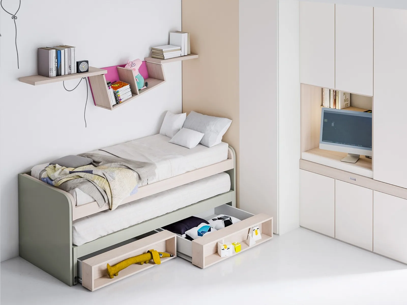 Al secondo letto estraibile, Cartesio aggiunge anche due cassettoni con vani a giorno frontali, utili per il guardaroba, la biancheria notte, i libri e i giochi, al fine di avere tutto in perfetto ordine. In alternativa è possibile cambiare configurazione al letto, sostituendo i contenitori con un terzo materasso a scomparsa, oppure eliminare i vani portaoggetti inserendo cassettoni più capienti, o infine scegliere il secondo letto con contenitore interno, ottenendo così il massimo della personalizzazione in termini di necessità abitative;