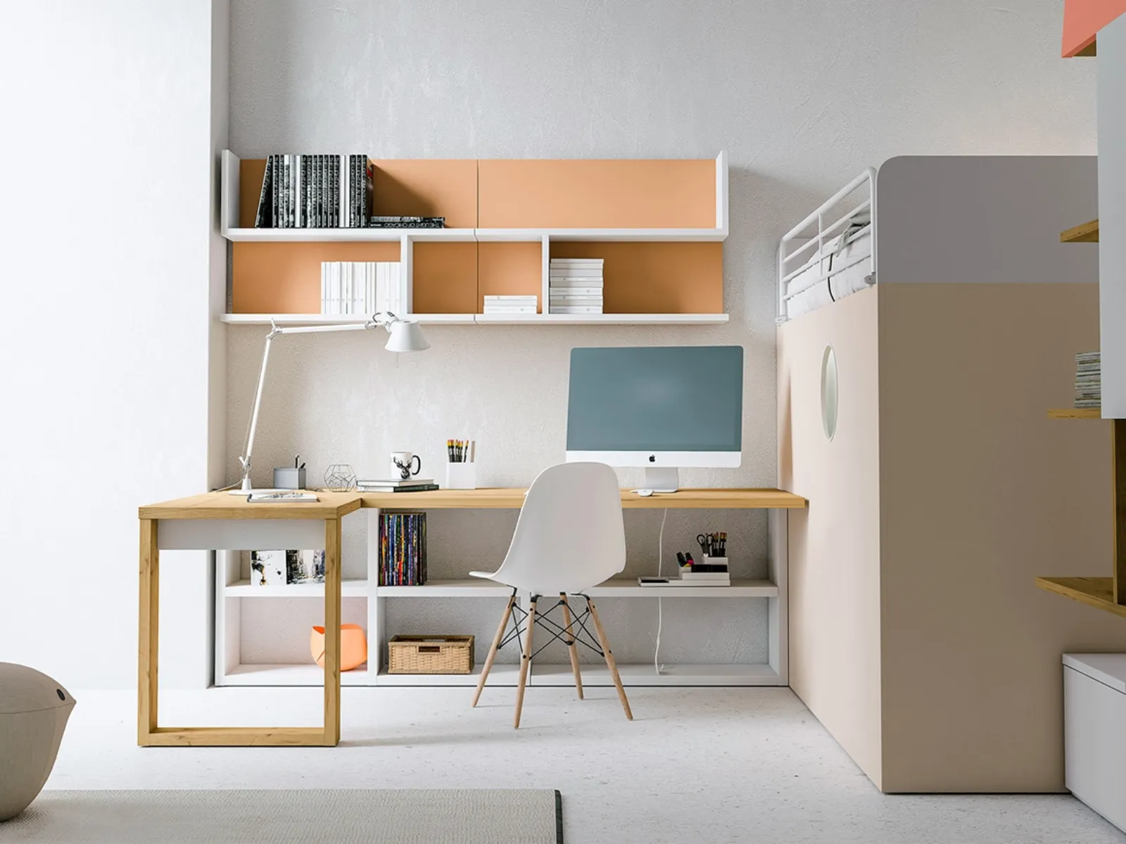 - per completare la cameretta, Dielle ha pensato anche ad un angolo studio ben attrezzato, composto da: la scrivania angolare, molto ampia; il modulo Master, che fa da sostegno al piano, dotato di vani a giorno e il pensile sospeso Snake che fa da libreria. Per rendere più accattivante e di design il progetto d’arredo, l’area studio presenta un appoggio a terra dal forte impatto visivo: la gamba Creative, posta in continuità col top e accomunata dal medesimo spessore (3,5 cm), disponibile in tutte le finiture da catalogo.