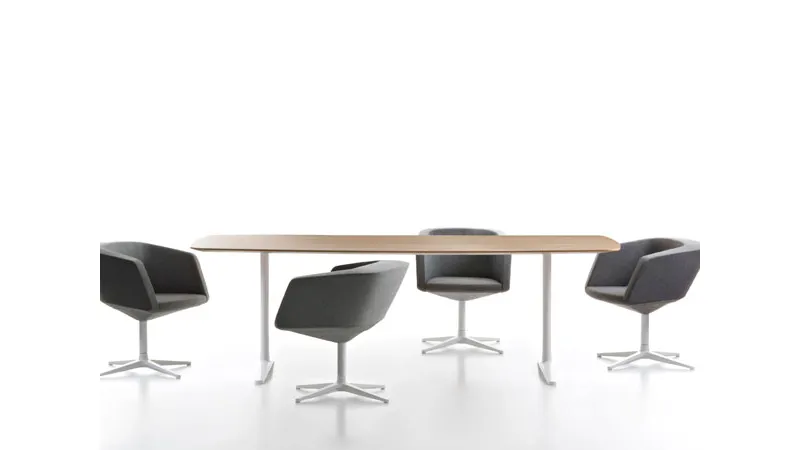 La poltrona da meeting room di alto livello Dininho Maxdesigncriprende le linee essenziali di Dino ma ne riduce il volume mantenendo comfort e eleganza e acquisendo nuova leggerezza. La sua geometria a diamante avvolgente e rilassante è l'ideale per una board-room da completare con Plato e Dino. La struttura interna è in acciaio schiumata con poliuretano espanso; la base in alluminio stampato con meccanismo girevole è disponibile nelle finiture verniciato bianco o nero o spazzolato lucido.Ha anche la base in acciaio verniciato nelle finiture bianco lucido e nero opaco e il rivestimento fisso in tessuto o in pelle.