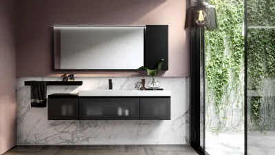 Descrizione: Base in laccato Nero opaco con frontale in vetro acidato e cornice in alluminio nero. Piano con lavabo integrato in Corian Bianco. Pensili a muro in nero laccato, mensola in alluminio finitura Nero con portasciugamano a sinistra. Specchio “Tecnica”