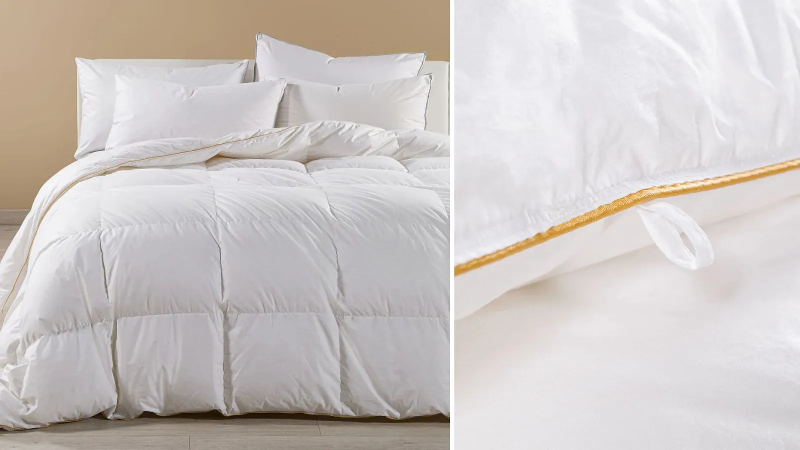 Luxury di Caleffi è in 100% piumino bianco d’oca siberiana. È un piumone rivestito in percalle di puro cotone, con profilo in raso color oro.
