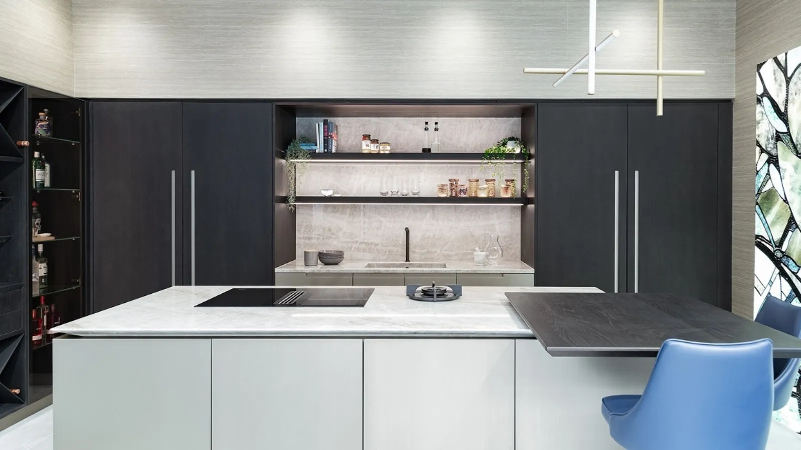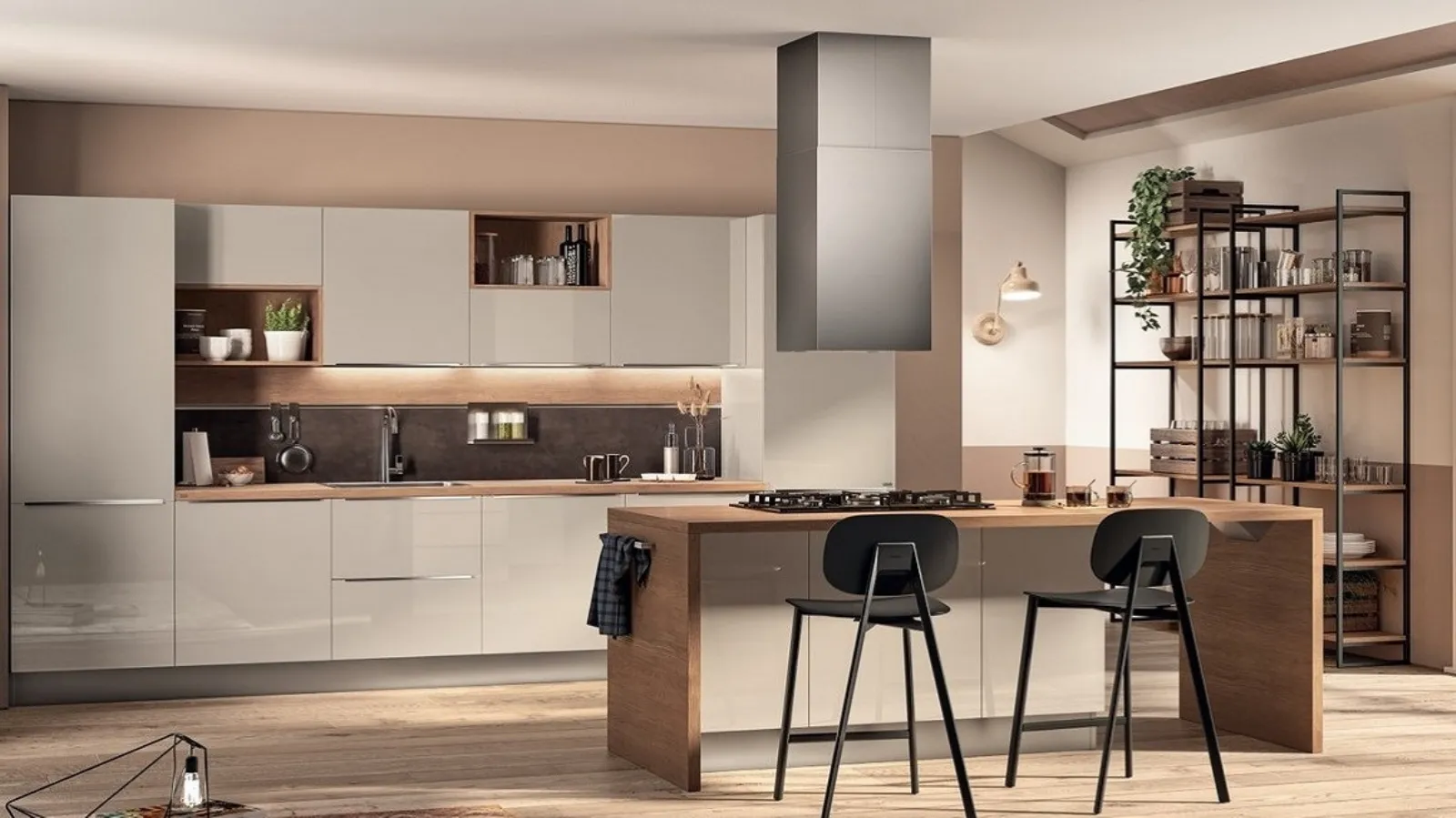 Tinte tenui per D20 By Doimo Cucine, ante lisce con il top dell’isola in Okite.