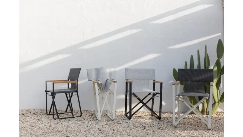 Le nuove poltrone da giardino hanno una notevole personalità e sono progettate per catalizzare l’attenzione, ma ciò non necessariamente significa che abbiano anche dimensioni importanti. Non è affatto difficile, cioè, trovare poltroncine in grado di offrire un alto livello di comfort, esteticamente molto accurate e realizzate con materiali di prima scelta. Hanno ingombri ridotti oppure sono pieghevoli, dunque adatte davvero a qualsiasi spazio outdoor. Balconi compresi. In foto Ocean di Unopiù, design Alessandro Andreucci - Christian Hoisl, novità 2018. Pieghevole e leggera, questa poltroncina è la rivisitazione della classica sedia da regista nonhcé il risultato di un armonioso accostamento di alluminio, teak (per i braccioli) e tessuto tecnico (polivinile 60 per cento e poliestere 40 per cento) di colore bianco canapa o brown.