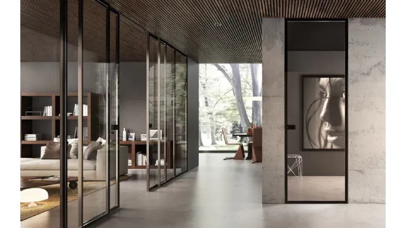Ultimamente negli edifici moderni e nelle nuove costruzioni si riscontra un maggiore utilizzo delle porte a vetri scorrevoli per interni, validi complementi d'arredo che permettono non solo di separare gli ambienti ma anche di arredare le stanze secondo uno stile fresco e dal design accattivante. Queste porte sono particolarmente utili in tutte quelle circostanze in cui non è disponibile sufficiente spazio per installare le tradizionali porte a battente, infatti la porta scorrevole permette di impiegare poco spazio svolgendo la stessa funzione. La presenza di binari metallici fa in modo che il pannello di vetro scorra parallelo alla parete oppure internamente ad essa occupando conseguentemente minore spazio rispetto a quello necessario all'apertura di un'anta. Per questa ragione le porte scorrevoli sono indicate per piccoli servizi igienici, mansarde e appartamenti dalla metratura ridotta. La presenza del vetro inoltre migliora l'illuminazione in quanto, essendo trasparente, fa filtrare la luce all'interno della stanza in quantità maggiore rispetto a una finestra. Nella foto: porta Garofoli