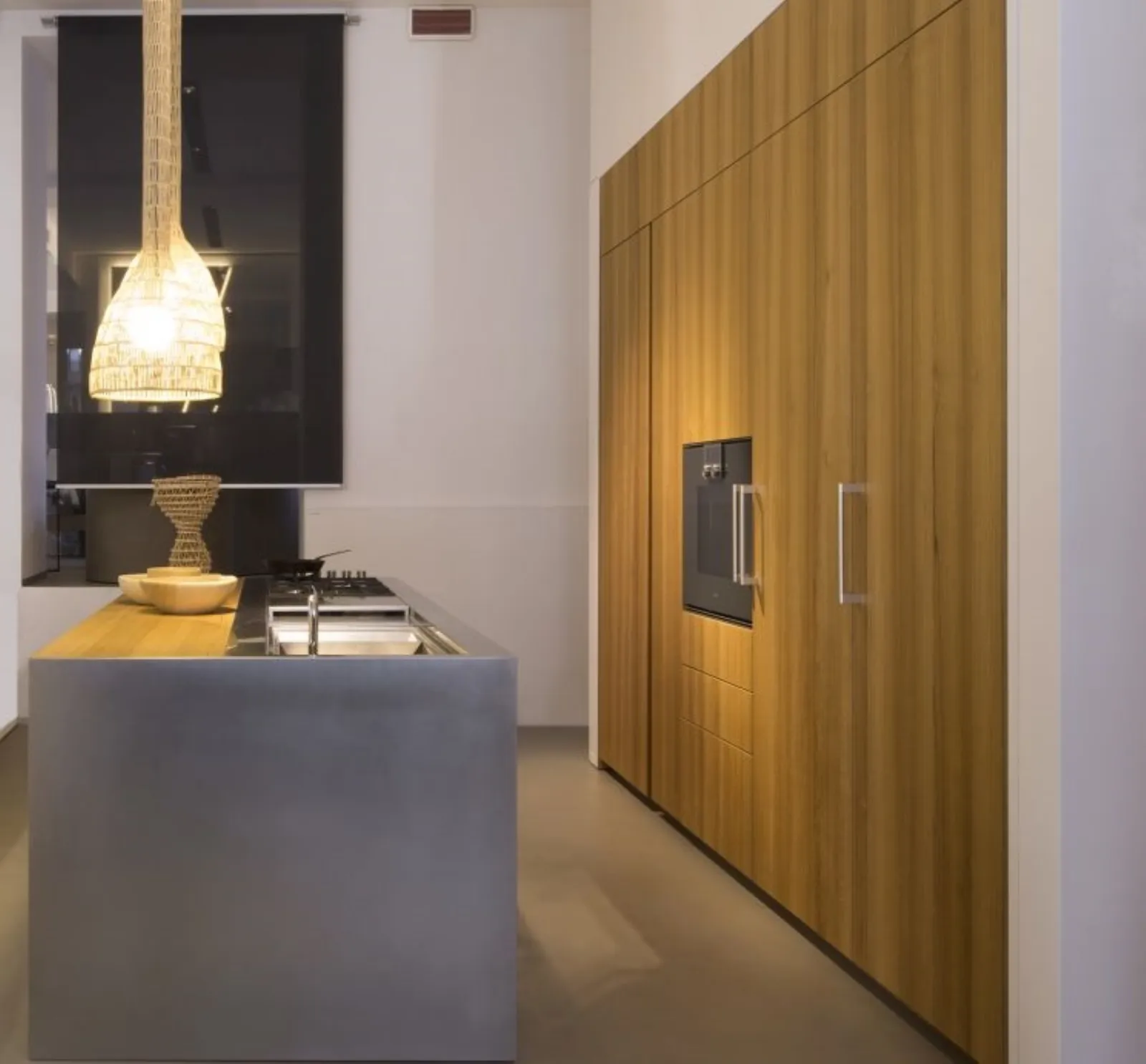 Salone del Mobile 2016 anticipazioni: tornerà anche la biennale EuroCucina e Dada presenterà Hi-Line VVD, la reinterpretazione estetica del suo best-seller Hi-Line affidata a Vincent Van Duysen. Le peculiarità? Una nuova dinamicità e un’eleganza contemporanea ottenuta grazie al contrasto tra esili spessori di fianchi e terminali, forti spessori dei piani di lavoro e all’alternanza dei materiali, come pietre naturali che dialogano con essenze e alluminio nero. Hi-Line VVD si arricchisce di ulteriori basi e cassetti a giorno, carrelli sotto top, mensole, vetrine e vasca attrezzabile per il lavaggio in pietra. Nei giorni del Fuorisalone, nel concept store di Via Statuto, Key Cucine esporrà invece Basik (nella foto), cucina composta da un’isola attrezzata, un monolite dall’estetica rigorosa ed essenziale con due anime: per metà realizzato in acciaio inox AISI 304 satinato e per l’altra metà rivestito in teak. Anche il top è diviso tra la sezione in acciaio che integra la grande vasca rettangolare corredata da tagliere e accessori scorrevoli, affiancata al piano cottura, e la sezione in teak che funge da ampio piano di lavoro e piano d’appoggio. A parete, l’armadiatura a colonna con aperture a battente che porta il forno e nasconde al suo interno frigorifero, una colonna enoteca con piano lavori estraibili, prese elettriche e vani portabottiglie, ripiani e cassetti in legno o acciaio (estraibili e non) con illuminazione a led.