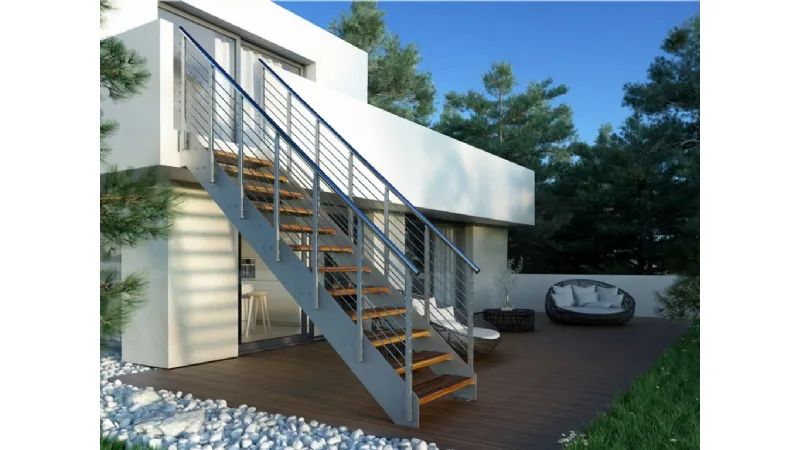 Come anticipato nel precedente capitolo, un aspetto fondamentale da tenere in considerazione per la scelta di tipo di scala da esterni più adatta è quello legato allo stile dell'abitazione, in quanto la scala dovrà uniformarsi con l'estetica generale, così da risultare perfettamente integrata. lo stile più attuale è certamente quello moderno e, di conseguenza, le scale esterne moderne sono quelle più comunemente impiegate. Per quel che riguarda il tipo di struttura è bene dire che essa può prevedere l'installazione di scale esterne a chiocciola, lineari oppure a sbalzo, soluzione molto particolare ed apprezzata per ottenere un effetto di grande leggerezza con una forte caratterizzazione della facciata in cui viene sistemato questo tipo di scala. Le scale esterne moderne si caratterizzano spesso per l'impiego di ferro o acciaio, materiali ideali per realizzare delle strutture leggere e dalle linee pulite, magari abbinate a particolari parapetti in vetro, capaci di proteggere la salita o la discesa e al tempo stesso di enfatizzare la leggerezza dell'intera scala. Non sono da disdegnare nemmeno le scale esterne in muratura, solide, sicure e stabili, che richiedono uno spazio adeguato per poter essere realizzate in modo funzionale; per far in modo che risulti no moderne va scelta con attenzione la forma ma soprattutto il tipo di rivestimento. Uno dei rivestimenti per le scale esterne maggiormente utilizzati è il gres porcellanato, materiale molto apprezzato perchè solido, resistente e perfetto per ottenere svariati effetti estetici differenti, come l'effetto legno, pietra o marmo, coniugando resistenza e bellezza. Grazie al gres porcellanato è possibile ottenere delle scale esterne moderne che riproducono l'effetto preferito con un grande risparmio sui costi, soprattutto se si confronta con quanto potrebbero costare dei gradini in marmo. In foto: scala Externa Rintal, un modello realizzato in acciaio zincato, con la possibilità di scegliere tra due differenti tipi di gradini, quelli in lamiera forata o bugnata o dei particolari gradini in legno di iroko, essenza scelta perchè si tratta di un legno particolarmente resistente agli agenti esterni.